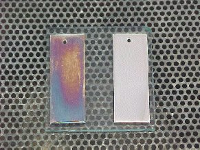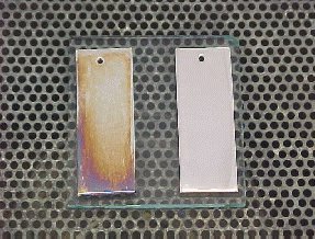 Samples exposed to 200ml distilled water/0.5ml ammonium sulphide solution for 1 hour. Standard Sterling on the left, Argentium® Sterling Silver on the right.