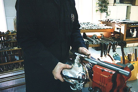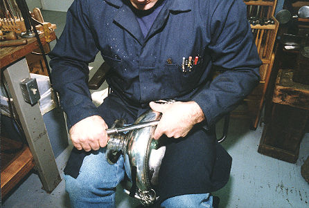 The burnishing continuesfrom the outside of the piece to the insideback and forth as many times as it takes to make surface as smooth as glass. This process requires a tremendous amount of pressure to force the dent back to where it's level with the surface around it...