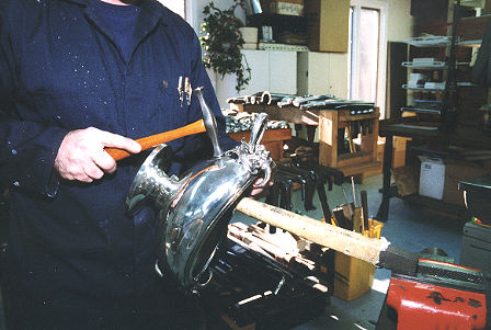 A wooden hammer is used to remove the edge dents on the cover, making sure every hammer blow strikes squarely without distorting the metal. A highly polished t-stake is used to back-up the cover and absorb the blows... |