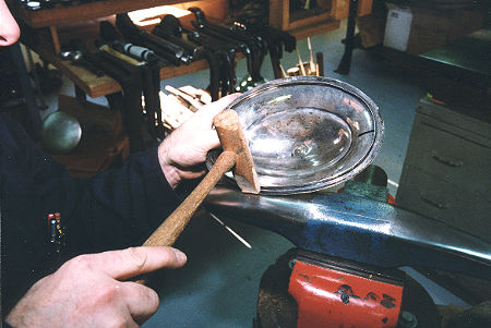 Burnishing out the body dents. Whenever possible, burnishing is preferable than hammering because the metal stretches very little and produces no hammer marks...