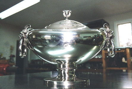 The finished piece after 5½ hours of work! Notice that the monogram on the body remained intact. The entire piece was hand finished to look as it would have before its battering. The tureen sits atop a surface plate which was used in conjunction with a height gauge to insure that the piece is now level. |