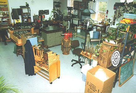 Workshop layout. A rack of hammers (made from a shoe rack) is in the lower left corner. Notice the red universal vise in the center of the image. This vise allows for 360 degree movement in all directions.