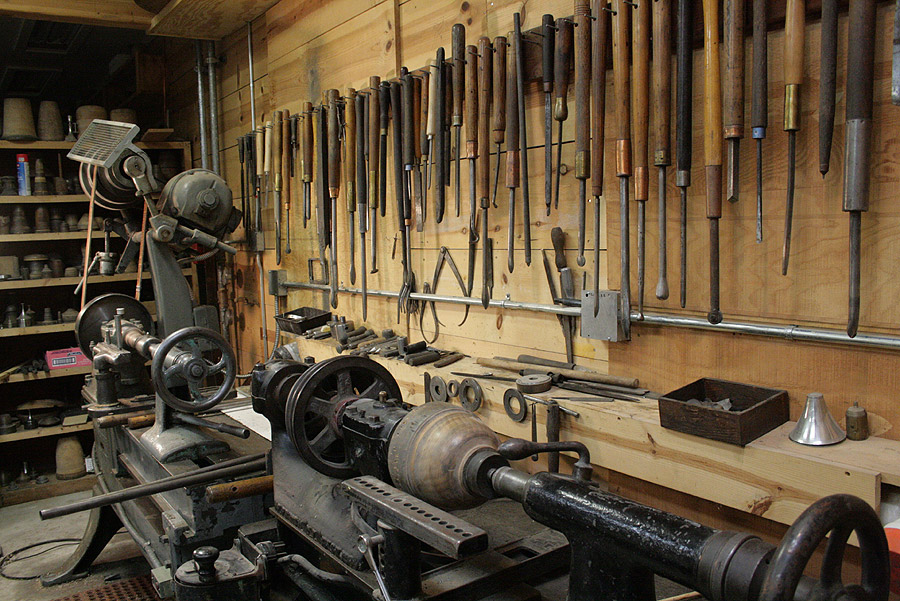 What you're looking at: Spinning lathes and tools used for creating spherical shapes over wooden or metal chucks..