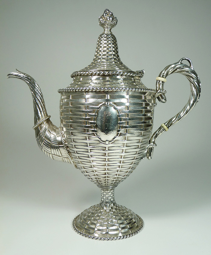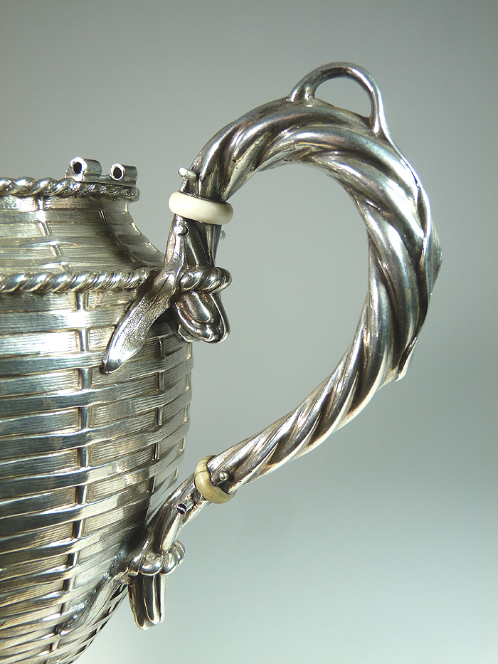 This unusual basketweave coffepot had a lower intact insulator and a damaged upper. I replaced the damaged insulator with pre-ban ivory. Both insulators are solid, with extensions going into the body sockets and handle, then secured with new sterling pins.