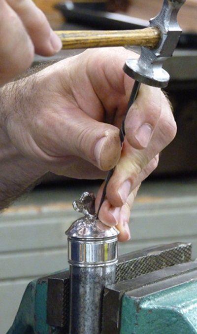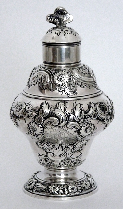 Made in London in 1748, this tea caddy, with its beautiful chasing and delicate heraldic engraving, is one of a pair that came to me for restoration. There were approximately 12 holes in each top (unbelievably, they had been made into salt & pepper shakers!). I welded the holes with pulse arc arc welder using sterling wire for a perfect color match, and then rechased the areas repaired. I burnished out numerous body dents from the pair and removed corrosion from the "salt shaker." Finally, I repatinated and hand finished the tops and bodies of both caddies. |