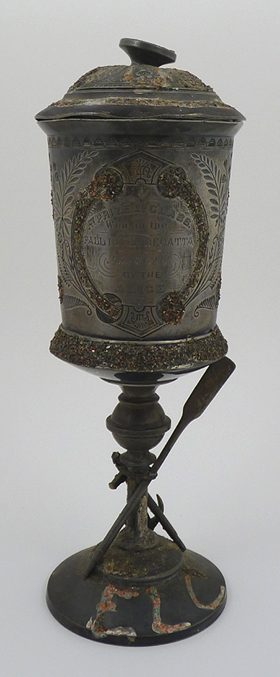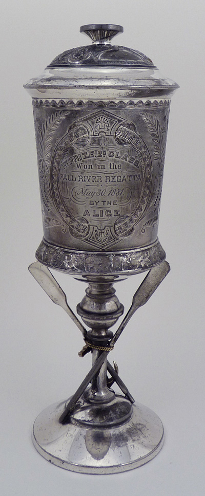 All that glitters? Well, someone got ahold of this Rogers 1881 plated regatta trophy and decided it would look infinitely better with glued 3-dimensional sparkles. When I received it I was horrified, then amused. The customer wanted to donate it to the Fall River (Massachusetts) Historical Society, and requested it be put back to the condition it was in prior to its defacing. I removed the glue and sparkles, reattached the oar section, straighten the cup, removed dents, corrected the body and cover rims, and gave it some major cleaning. It's now ready to be seen by the public with just enough silver remaining to make it presentable. Note: There are three contact points on the finial where there was most likely a sailboat figurine. (This wasn't a rowing event as there are sailboats engraved on the opposite side of the cup.) |