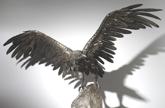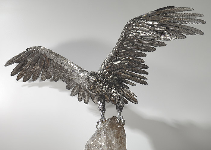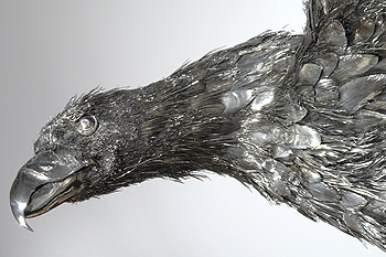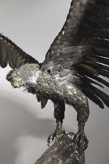 The below images are of a beautiful Buccellati sterling eagle with a 4½-foot wing span. Buccellati's signature silver animals are a result of a new method of creation known as lavorazione a pelo or “hair-like workmanship.” It is the result of brazing many silver hairs or feathers, giving the exact appearance of the “natural” coat. After researching wing and feather anatomy, here's what I did to bring the eagle back to life...