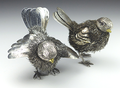 The bird on the left has been "coiffed," while the one on the right is waiting its turn. I brushed out the individual hairs then cleaned the entire piece with alcohol, highlighted with a polishing cloth, then protected with Renaissance wax. Using a silver polish then rinsing the birds would have left moisture inside their bodies. |