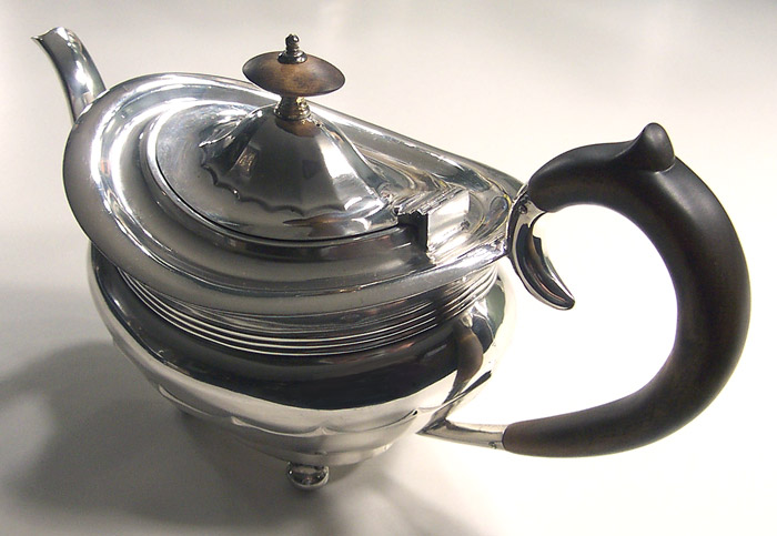 This 1822 English sterling teapot came to me missing its wooden finial and handle. I created new components from tight-grained satinwood and used a black walnut stain to age them. I also made two new sterling pins to secure the handle in the sockets. |