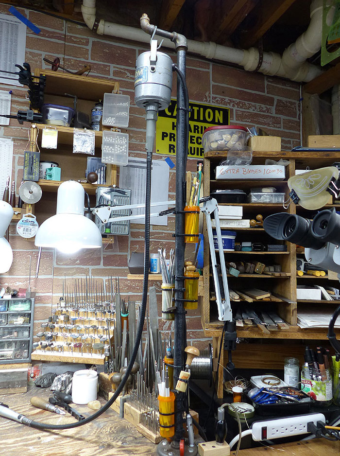 Flexshaft hanger with pill bottles holding tools. Under the lamp sits a stepped organizer for Flexshaft accessories and needle files. |