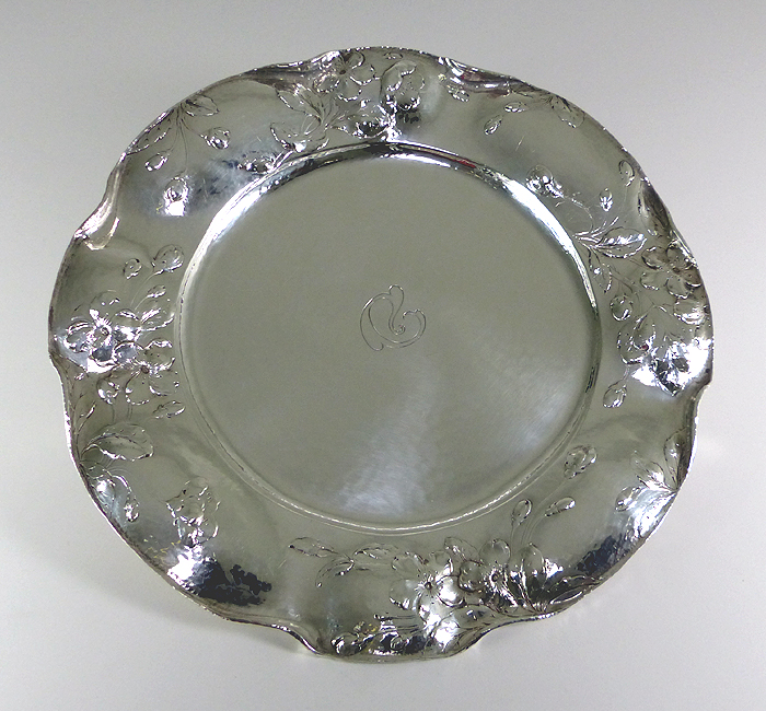 This 10.5" .9584 silver plate came in with major scratches from using it as a carving board. Sacrilege! (ALWAYS cut on a board, not your silver.) I delicately removed the major scratches while retaining the patina (fine age marks) and planished finish. I then cleaned the plate and protected it from tarnishing with MeGuiar's Quik Wax. |