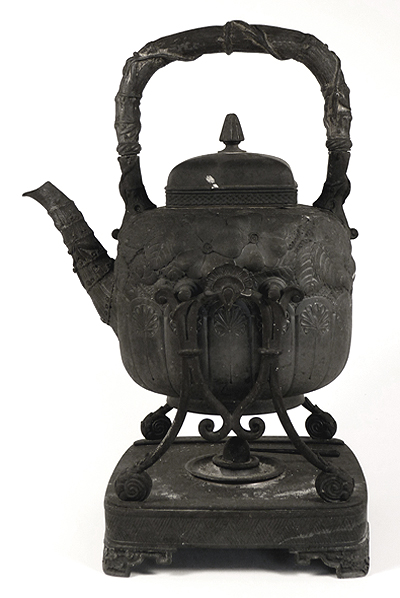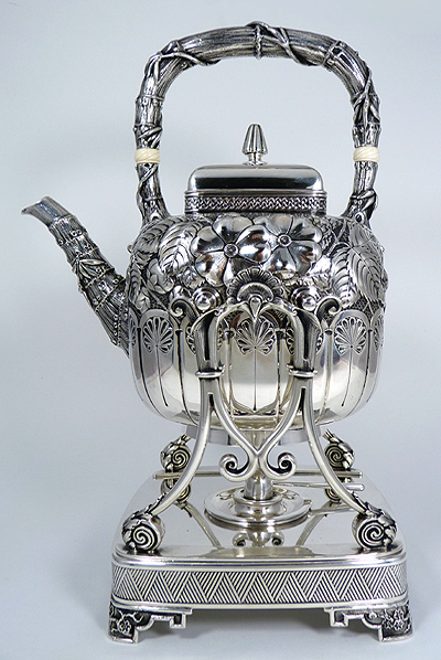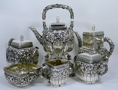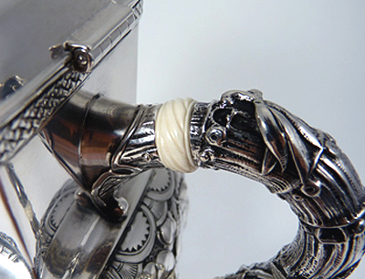 This beautiful 19th century hand chased Gorham sterling teaset was fire-damaged. Every piece was fused soot and the ivory insulators were charred to a crisp. The pieces were first cleaned, then dents were removed. The set was repatinated and hand finished, giving it the soft finish which it had prior to the fire. I then carved pre-ban ivory insulators and installed them with new sterling retaining pins on the kettle, teapot, and coffeepot.