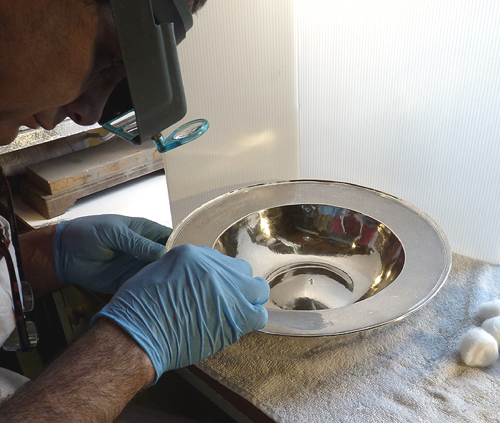 Identical polishing and preservation methods were used on this Revere christening basin for the same museum. Notice the maker's mark inside the basin. |