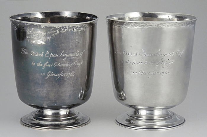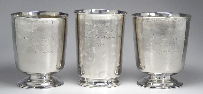The conserved and preserved Revere silver on display including a Moulton beaker I worked on. |