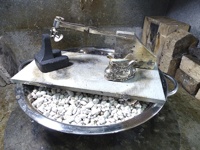 Below: This third-hand is used as an articulating "back-stop" for reflecting heat back onto the piece ythat's being brazed. I attached a piece of hard solder board to tweezers with stainless steel wire. |
