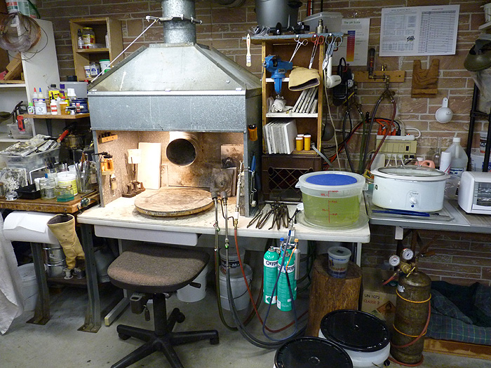 heat-resistant glove hangs to the left of the bench for emergencies.