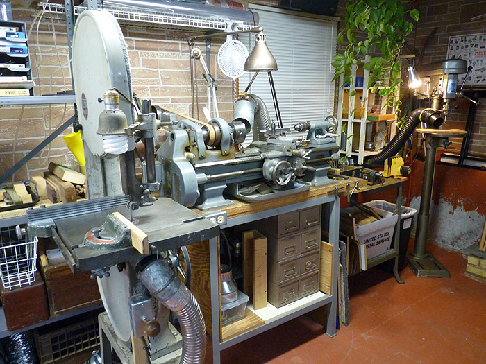 From the left is a band saw, a 9" South Bend machine lathe from WWII, and drill press.