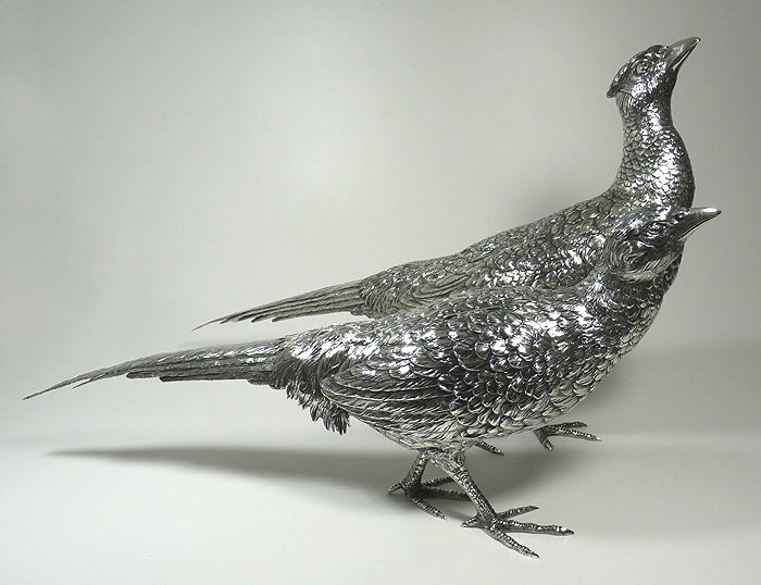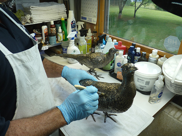 The top image of these two-foot long pheasants shows me removing dried polish by tapping and lifting it out with a China white brush and warm water. When wet, the bristles won't scratch. After the dried polish was removed, I used Blitz Silver Shine Polish to remove the tarnish and give the pheasants long-term protection. |