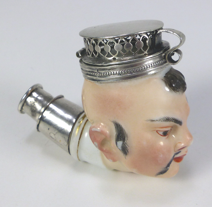 This hand painted silver and porcelain pipe was sent to me because of a poor repair. The hinged cover and lower band were both mounted to the side as opposed to the back of the head. I removed the band, removed the major dents around the crushed gallery decoration, then welded the cover's hinge assembly back. The top was then remounted so the hinge was in the rear. Sterling was added to the front of the band so the reformed thumbpiece would click shut when the cover is closed. I maintained the original finish and only cleaned the pipe. Historical background for the porcelain pipe from the owner... "According to an entry in the Vielsdorf registry, October 1772 we found the design descriptions for this pipe. We can conclusively state where and when it was made. It is the only survivor, and an extreme rarity. It came to me from the Musee de la Pipe in Lausanne, Switzerland after the Museum closed down. These 18th century porcelain pipes are few and far between, very rare, and seldom seen outside Museum venues. They can he found scattered around the world in the collections of the V&A, Smithsonian, Museum De Grasse library Baroness Alice de Rothschild, and the Amsterdam Pipe Museum. I currently have the most pipes in private hands." |