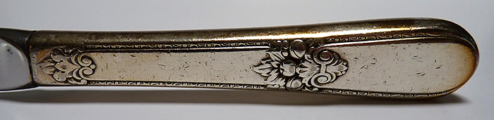 Above are images showing both sides of a silver-plated luncheon knife exposed to the open air for 14 months. The top image is the knife as it sat on a buffet, face up. The bottom image is of the side that was facing down and, therefore, not directly exposed to harmful tarnish-producing particulate. This is a clear illustration that silver will maintain its finish over a longer period when kept in a case or enclosed cabinet. (There should be no outgassing from the case or cabinet. If it is made of wood, the interior surface should be sealed, preferably with lacquer or water-based polyurethane. If latex paint is used, allow it to dry for at least four months.) |