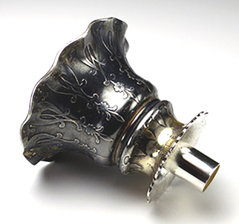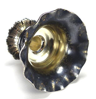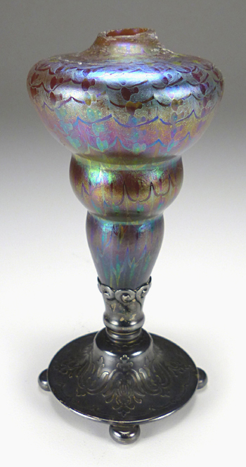This beautiful bud vase came to me with the top portion broken off. I removed the remaining glass and plaster inside the top in order to solder sterling tubing that would fit inside the body of the piece (see top two images). I then straightened the vase and leveled the four feet. I completed the job by polishing the sterling components and reattaching the top with plaster, which is the traditional method. |