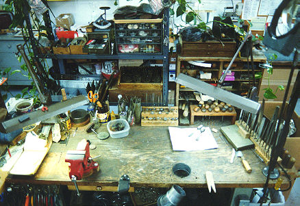 This is my workbench. Clockwise from the back left corner of the bench: small round surface plate, burnishers, dental picks, silversmith's rifflers, flexible shaft abrasives and burs with needle files mounted to the rear, gravers in a stand, hand files in a stand, flexible shaft, wooden bench pin, two ventilation pipes, rubber bench pin, and a bench vise. Dust collecting ducts run throughout the workshop.