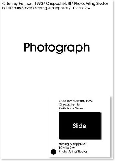 Slides & Photographs What information should you include on each slide and photograph? 1. The copyright © sign, 2. your name, 3. the date the object was created, 4. your city, state & country, 5. the name of the individual or company that photographed the piece, 6. the object type (e.g. vase), 7. the object title (e.g. "Blossom"), 8. materials, and, 9. dimensions. It is also important to use the correct medium when labeling. Paper conservation experts recommend a #2 pencil (preferred) and Sanford's® "Sharpie®" ultra fine point permanent marker for photographs with resin-backed paper. Both mediums can be found in most stationery stores. Stay away from water-base and ball point pensthey take longer to dry, may transfer to other materials, and could cause damage to the image. Only a #2 pencil should be used on paper-backed photographs. Always place the photograph on a clean, hard surface before marking. Never use labels, for they may eventually react with the paper and image. And always write information behind the darkest edge of the image, never in the center.