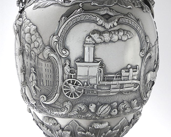 The 21" tall ewer was created in 1855 by Grosjean & Woodward (G&W) of New York, but the commission was most likely taken by Cincinnati retailer Beggs & Smith (1848-1861). The Cincinnati, Ohio, fire department was the first in the nation to pay its firefighters. This ewer was presented to its very first fire chief upon his retirement. The main body and base were both raised from flat discs of silver. The base stem, neck, and spout were seamed and fabricated. The cast elements are the firemen's bugles, helmets, fire axes, and fireman stationed atop the handle. All castings were chased and/or finished prior to assembly. The silversmithing, chasing, and engraving are all beautifully executed. This piece would have been originally patinated, but throughout its life the patina was gradually polished away and encrustation started to form.