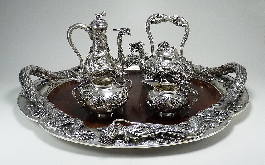 This magnificent teaset shipped to me from Hong Kong required an enormous amout of work. I forged new sterling wiskers for every dragon head because they were missing. This image is the finished set. |