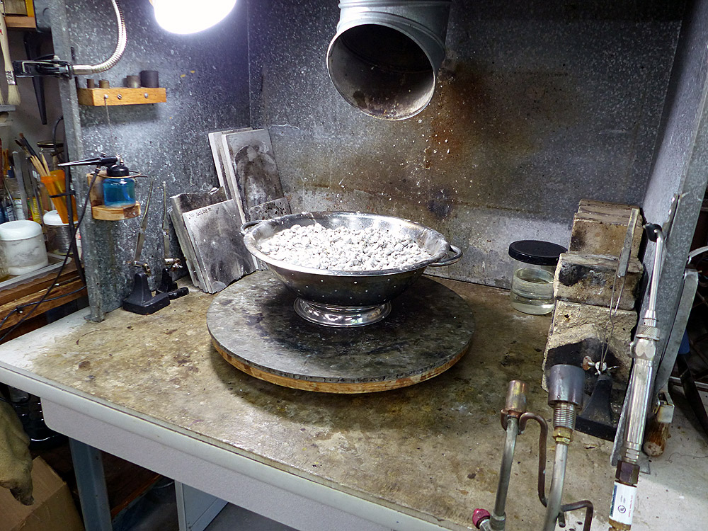 This is a close-up of the interior of the fume hood. All fumes are pulled back and up through the blower via articulating elbows. The hinged panel comes down to aid in fume extraction. |