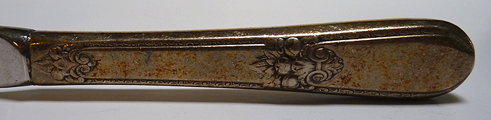 Above are images showing both sides of a silver-plated luncheon knife exposed to the open air for 14 months. The top image is the knife as it sat on a buffet, face up. The bottom image is of the side that was facing down and, therefore, not directly exposed to harmful tarnish-producing particulate. This is a clear illustration that silver will maintain its finish over a longer period when kept in a case or enclosed cabinet. (There should be no outgassing from the case or cabinet. If it is made of wood, the interior surface should be sealed, preferably with lacquer or water-based polyurethane. If latex paint is used, allow it to dry for at least four months.) |